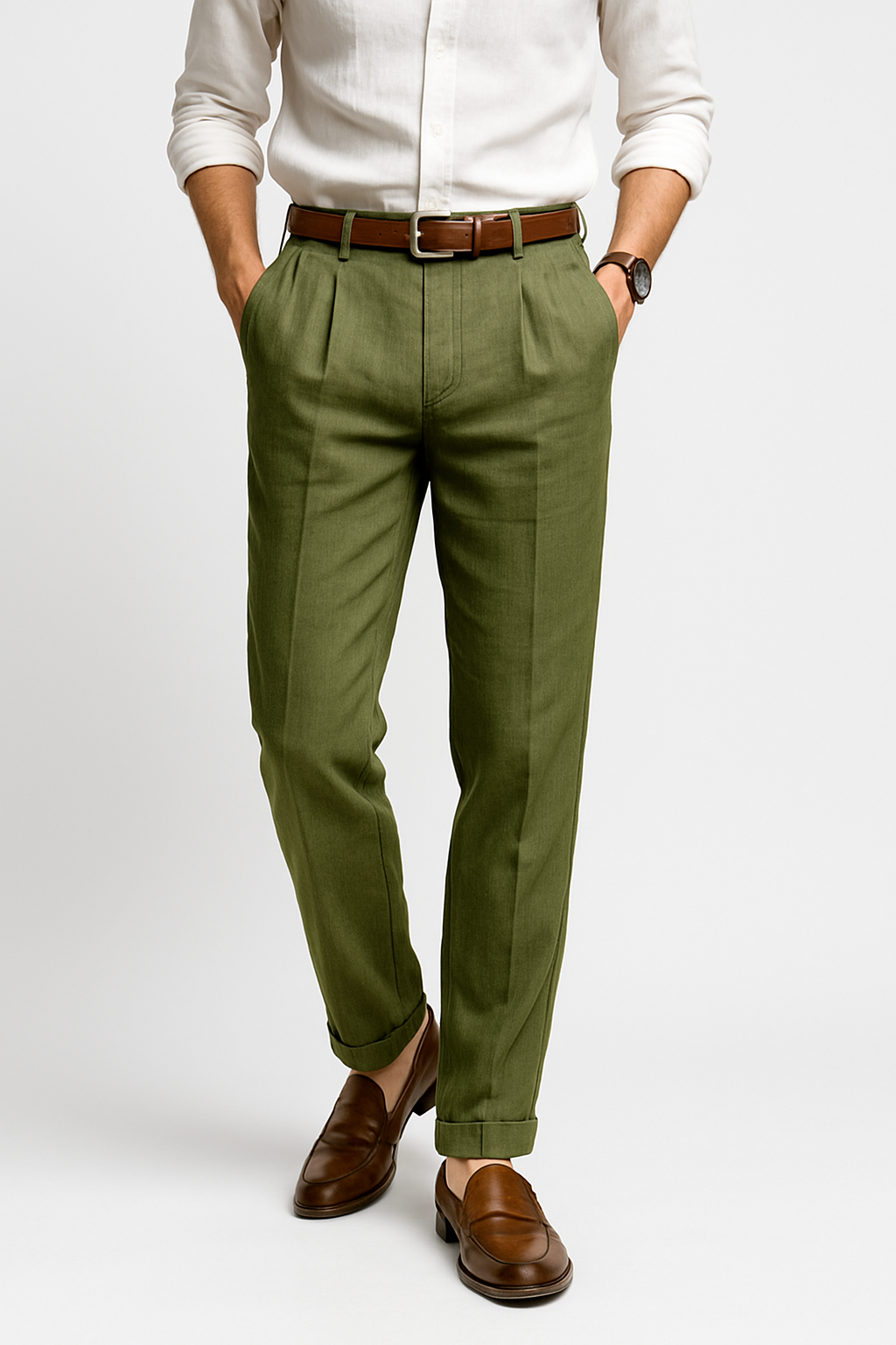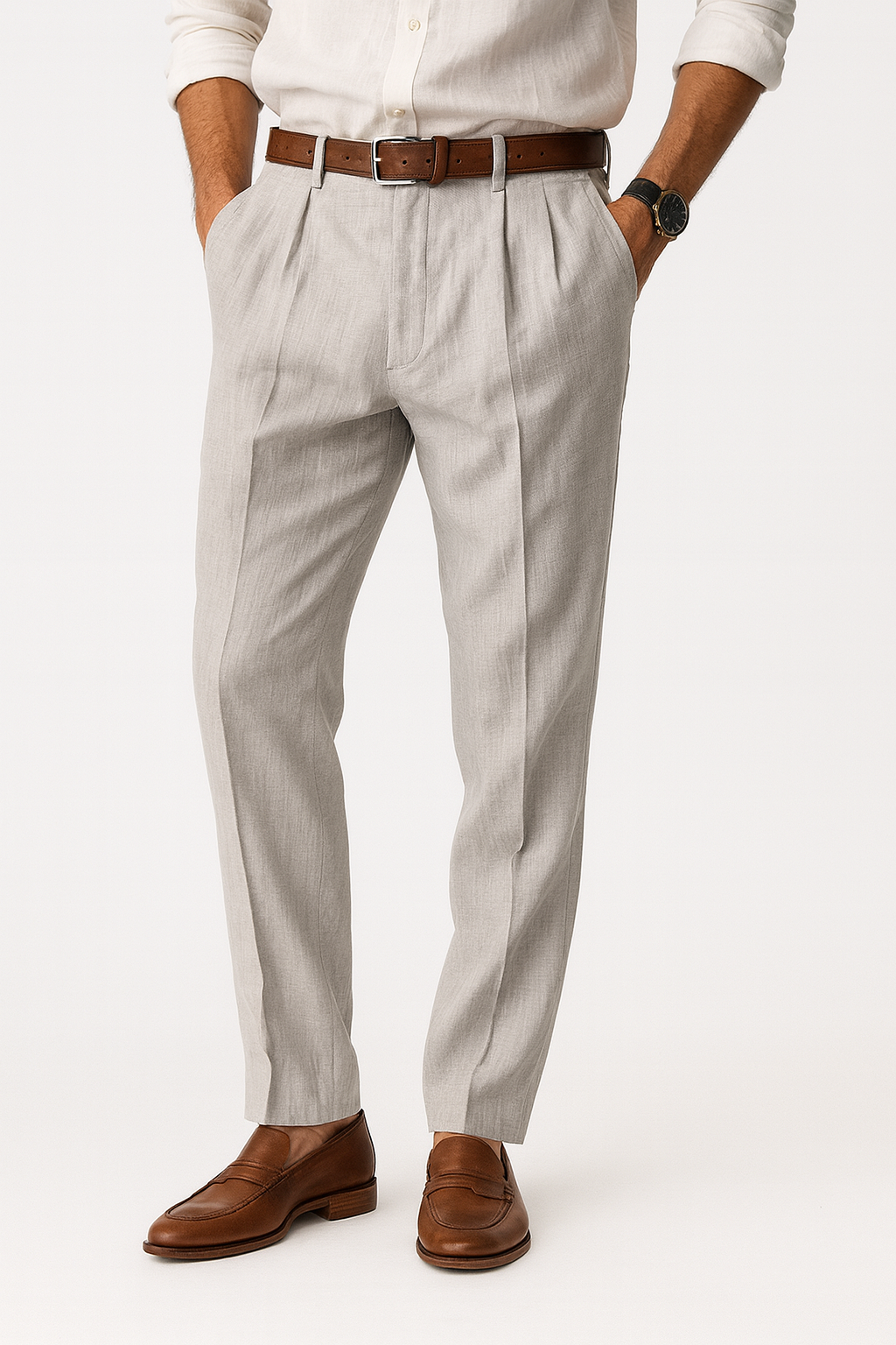 Oppnå et stilig uttrykk samtidig som du holder deg helt komfortabel med Hisan | Elegant Linbukser en bukse som kombinerer elegant snitt med letthet. Den er laget i en eksklusiv italiensk blanding av bomull og lin, og gir en raffinert, men avslappet silhuett. Takket være sin strukturerte midje, definerte folder og avsmalnende ben, er dette den perfekte buksen for å holde stilen – også i varmen.